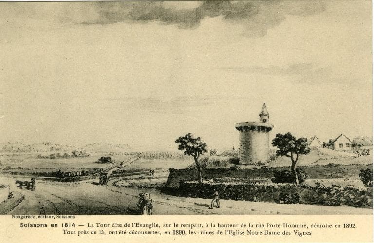 POP | Plateforme ouverte du patrimoineSoissons en 1814 - La Tour dite de l'Evangile, sur le rempart, à la hauteur de la rue Porte-Hozanne, démolie en 1892. Tout près de là, ont été découvertes, en 1890, les ruines de l'Eglise Notre-Dame des Vignes