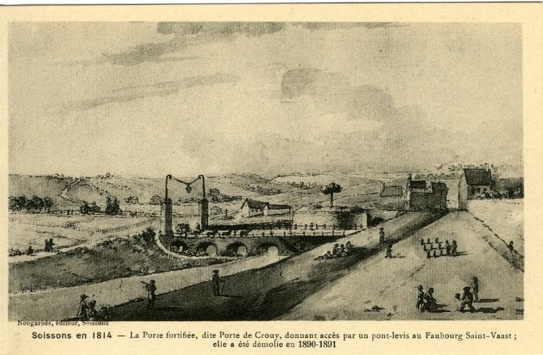 POP | Plateforme ouverte du patrimoineSoissons en 1814 - La Porte fortifiée, dite Porte de Crouy, donnant accés par un pont-levis au Faubourg Saint-Waast ; elle a été démolie en 1890-1891