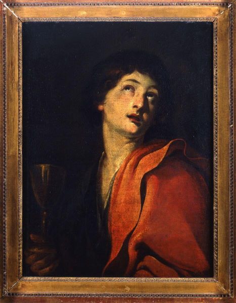 L’apôtre saint Jean est représenté en buste, légèrement de trois-quarts sur la gauche, mais avec la tête tournée vers la droite et le regard dirigé vers le ciel. Son visage juvénile se détache sur un fond sombre et uni. La bouche légèrement entre-ouverte, les yeux dirigés vers le haut et non vers le spectateur, ce saint Jean donne l’impression de se trouver comme transporté hors du monde sensible par l’intensité d’un sentiment mystique. En d’autres termes, il est en extase. Son épaule gauche est recouverte d’une draperie rouge dont le bord ondule est donne un certain mouvement à l’ensemble. Le mouvement de cette étoffe qui tombe sur son épaule gauche s’oppose à la rigidité de la pose du saint, à son état presque extatique. Il tient un calice dans la main droite. Son expression, la tête renversée, le regard vers le haut, indiquent qu’il s’agit d’un saint homme d’ailleurs identifiable par ses attributs. Après la Contre-Réforme, l’extase sera le vrai signe de la sainteté. L’Église demande aux artistes la représentation de ces moments surnaturels de la vie des saints. Ces images correspondent à l’invention mystique de la littérature chrétienne de l’époque. L’exaltation du culte des saints, qui s’inscrit en réaction contre la Réforme, est l’une des nouveautés iconographiques de la Contre-Réforme. Les commanditaires sont l’Église, les Ordres mais aussi les particuliers. Saint Jean est le seul apôtre présent avec Marie lors de la Crucifixion d’où le calice tenu entre ses mains (contenant le sang de Jésus). Il est également le plus jeune des apôtres d’où cette représentation juvénile. Mais c’est aussi celui qui vécut le plus vieux et resta le seul survivant, ce pourquoi on le représente aussi avec une barbe blanche dans d’autres tableaux. Ce tableau représente saint Jean dans une attitude caractéristique commune à quasiment toutes ses représentations : la tête tournée vers le côté et le regard dirigé vers le ciel. C’est une allusion à la façon dont il a reçu la révélation de l’Apocalypse dont il est l’auteur : “ J’entends derrière moi une voix puissante qui venait du ciel.”
