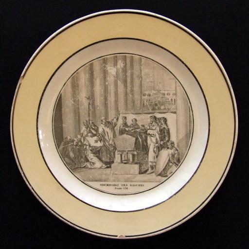 assiette plate au décor imprimé noir sur fond blanc représentant la soumission des Gascons en 638 après Jésus Christ dans le bassin ; aile peinte de couleur crème et délimitée par deux filets noir