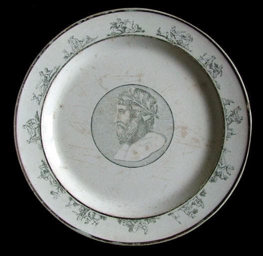 assiette plate au décor imprimé noir sur fond blanc représentant un homme couronné de laurier dans le bassin et des scènes mythologiques entourées de deux filets noirs sur l'aile