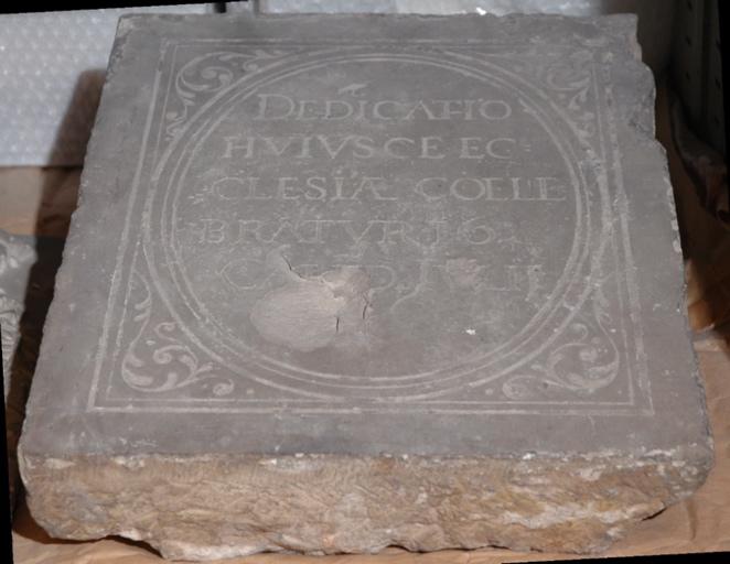 Inscription gravée dans un ovale : DEDICATIO / HUIUSCE EC / CLESIA COLLE / BRATURIG / C[...]D IULIJ