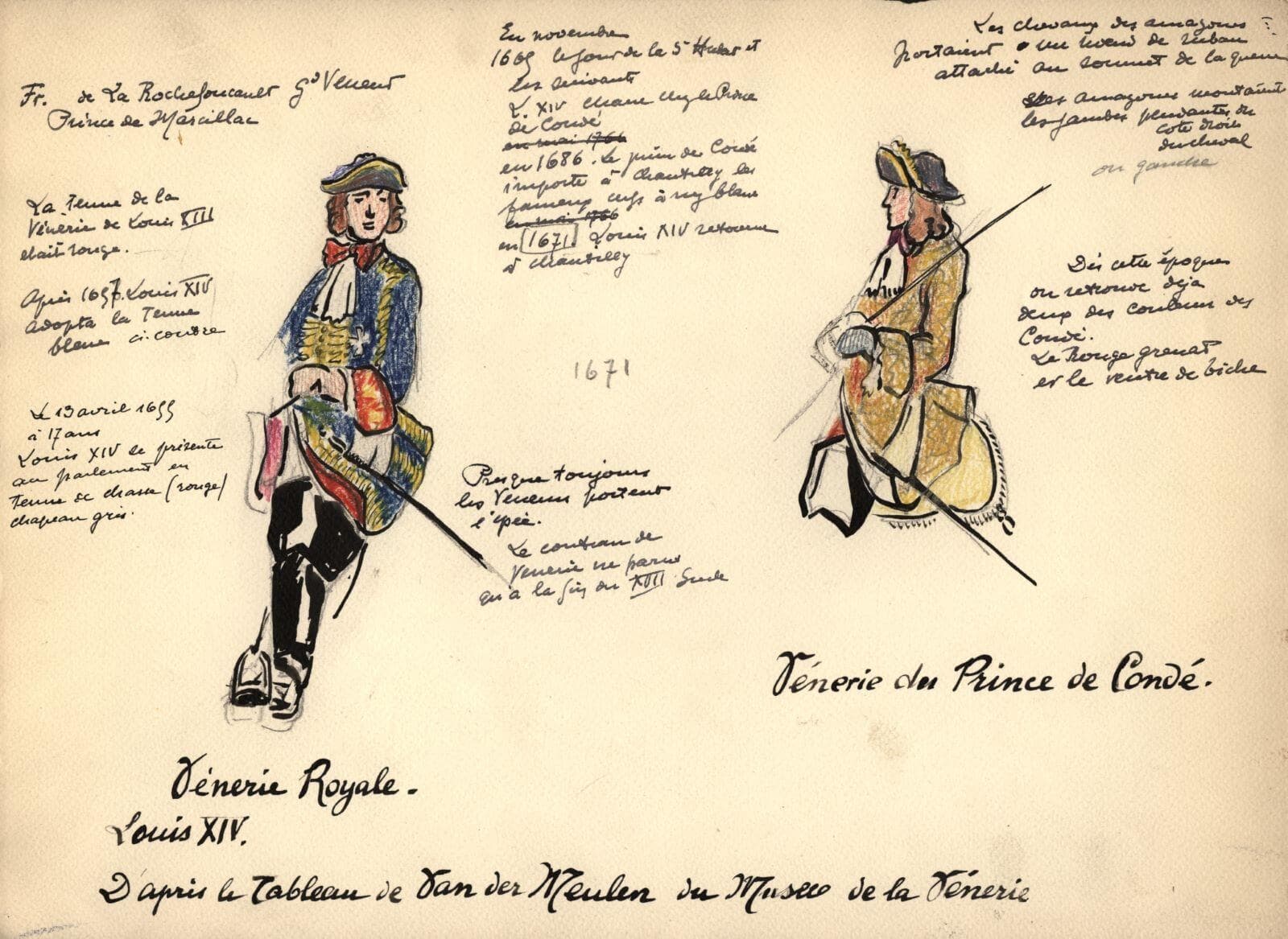 inscription : de haut en bas et de droite à gauche à l’encre noire : Fr. de La Rochefoucault Gd Veneur / Prince de Marcillac / La tenue de la \ Vénerie de Louis XIII / était rouge. / Après 1657 Louis XIV / adopte la tenue / bleue ci-contre / Le 13 avril 1655 / à 17 ans / Louis XIV se présente / au parlement en / tenue de chasse (rouge) / chapeau gris. / En Novembre / 1665 le jour de la St Hubert et / les suivants / Louis XIV chasse chez le prince / de Condé / En1686 Le prince de Condé / importe à Chambray les / fameux cerfs à nez blanc / en 1671 Louis XIV retourne / à chantilly / Presque toujours / les Veneurs portent / l’épée. / Le couteau de / Vénerie ne paru / qu’à la fin du XVIIe siècle / Les chevaux des amazones / portaient un noeud de ruban / attaché au sommet de la queue / Les amazones montaient / les jambes pendantes du / côté droit / du cheval / Dès cette époque / on retrouve déjà / deux des couleurs des / Condé. / Le rouge grenat / et le ventre de biche Titré en bas à l’encre noire : Vénerie Royale / Luis XIV / Vénerie du Prince de Condé. / D’après le tableau de Van der Meulen du Musée de la Vénerie