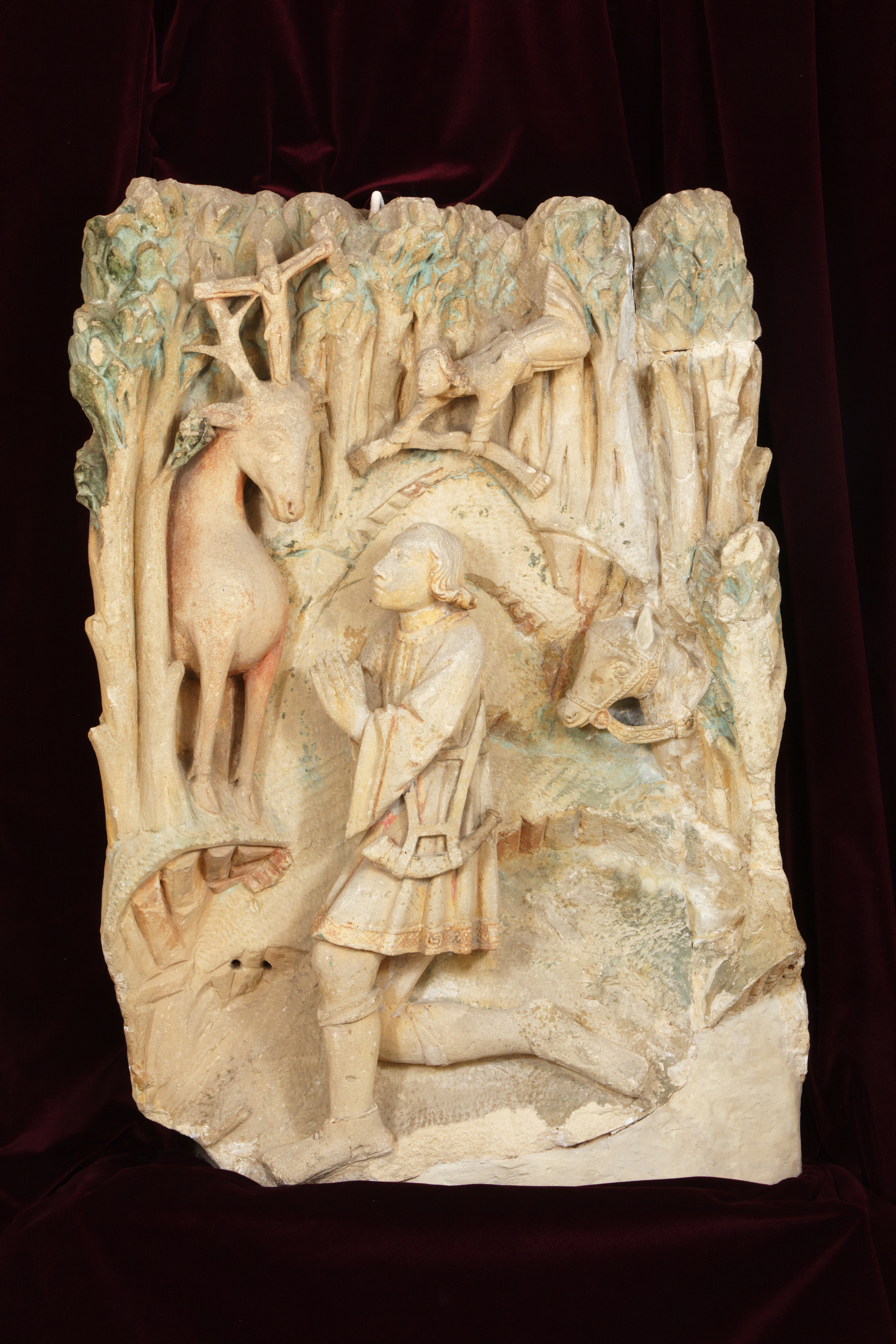 Figure tutélaire des chasseurs, saint Hubert occupe une place importante au musée de la Vénerie. Sa légende reprend des épisodes de la vie de saint Eustache. Elle relate la conversion d'un haut dignitaire de l'époque mérovingienne, chasseur impénitent, qui réforma sa vie après avoir reçu la vision d'un cerf crucifère qui l'interpelle : ' Hubert, Hubert, pourquoi me poursuis-tu ? Jusqu'à quand la passion te fera-t-elle oublier ton salut ? '. Devenu évêque de Maastricht, puis de Liège, Hubert évangélisa la région des Ardennes et mourut en 727. La représentation de la vision de saint Hubert se développa surtout à partir du XVe siècle, principalement dans la sculpture avant d'intéresser les peintres jusqu'à l'aube du XXe siècle (le cycle de Maurice Denis conservé au musée départemental Maurice Denis à St Germain-en-Laye, en est excellent exemple). Alors que saint Eustache apparaît en soldat romain, Hubert adopte le plus souvent la tenue d'un chasseur de l'époque médiévale avec une tunique, des hauts-de-chausses, un cor en bandoulière. Le haut relief de Chiffrevast est conforme aux représentations de ce sujet, notamment celle du jubé de l'église de Walcourt en Belgique (XVIe siècle). Descendu de son cheval, il tombe à genoux à la vue du cerf qui porte la croix. La perspective étagée permet de placer à l'avant-plan saint Hubert qui se détache sur des rochers, dont le traitement par guillochures évoque la sculpture sur bois, puis le cheval et le cerf fragmentés qui émergent des arbres. Un ange portant un phylactère complète ici la scène. Dans la pratique cynégétique, la bénédiction des chiens d'ordre a lieu chaque année au moment de la Saint-Hubert lors d'une messe qui inaugure ainsi la saison de chasse. L'observance de ce rituel constitue l'un des traits civilisateurs de la vénerie et son ancrage dans la tradition. Saint Hubert occupe donc une place de choix au sein du musée de la Vénerie à travers des uvres variées, parfois très spécifiques comme le portrait peint du duc de Bavière, grand-maître de l'ordre de Saint-Hubert, plus classiques comme la Messe de Saint-Hubert du peintre Tenré ou populaires comme des insignes de pèlerinage ou différentes gravures. Aucune sculpture de haute époque, dont saint Hubert est un thème fréquent, ne l'évoquait jusqu'à cette préemption. Geneviève Bresc suggère un atelier picard ou champenois pour la réalisation de cette oeuvre, dont la provenance n'est pas connue antérieurement à celle d'Eugène Bretel, qui ayant fait fortune avec son frère dans l'industrie du beurre dans les années 1870, réunit au château de Chiffrevast une remarquable collection d'oeuvres d'art. Texte de présentation destiné à la Revue du Louvre : Saint Hubert, dignitaire de l'époque mérovingienne et chasseur impénitent, réforma sa vie après avoir eu la vision d'un cerf crucifère. Devenu évêque, il évangélisa la région des Ardennes et mourut en 727. Son iconographie se développa à partir du XVe siècle, surtout dans la sculpture avant d'intéresser les peintres jusqu'à l'aube du XXe siècle. Notre haut-relief est conforme aux représentations de ce sujet, notamment celle du jubé de l'église de Walcourt en Belgique. Dans une perspective étagée prennent place à l'avant-plan saint Hubert qui se détache sur des rochers, puis le cheval et le cerf émergeant des arbres. Dans la pratique cynégétique, la bénédiction de la meute a lieu au moment de la Saint-Hubert, lors d'une messe qui inaugure ainsi la saison de chasse. Saint Hubert occupe une place de choix au sein du musée de la Vénerie à travers des uvres variées. Aucune sculpture de haute époque, dont saint Hubert est un thème fréquent, ne l'évoquait jusqu'à cette préemption. La provenance de cette oeuvre, peut-être picarde ou champenoise, n'est pas connue antérieurement à Eugène Bretel, qui fit fortune dans les années 1870 et réunit au château de Chiffrevast une remarquable collection
