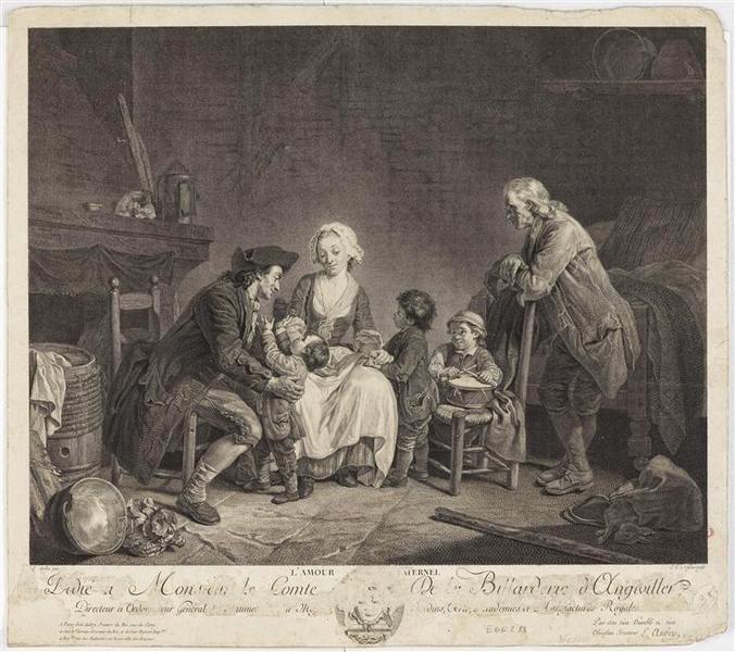 scène (famille, femme, homme, vieillard, enfant, paysannerie, pauvreté, costume traditionnel, bonnet, coiffe, chapeau, intérieur : salle commune, lit, chaise, cheminée, lampe, tonneau, jouet)