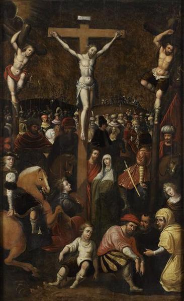 sujet biblique (Passion, Crucifixion, Vierge, sainte Marie, Les larrons, Le bon larron, Le mauvais larron, sainte Marie-Madeleine, saint Jean, cheval, cavalier, représentation du Christ, Christ en croix ; sainte du Nouveau Testament, saint du Nouveau Testament, baudrier, cape)
