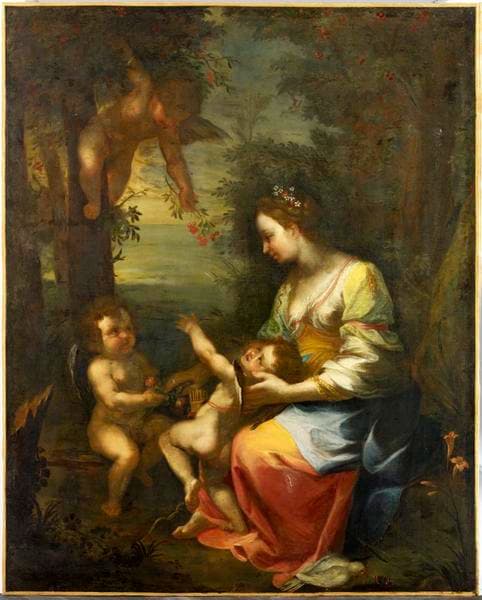 scène mythologique (déesse gréco-romaine : Vénus, putti, coiffure : chignon, couronne, animal, oiseau, colombe, insecte, lépidoptère, papillon, végétation, fleur, lys)
