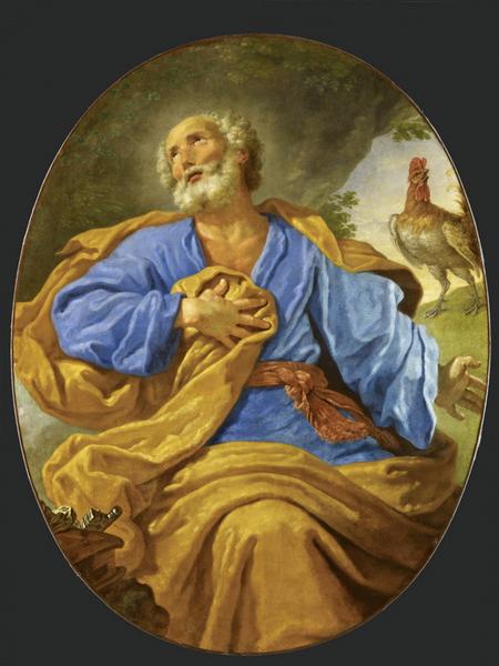 figure biblique (saint Pierre, barbe, attribut, animal : coq, clé, végétation, arbre)