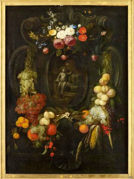 Guirlande de fleurs et de fruits entourant une représentation de la Vierge à l'Enfant