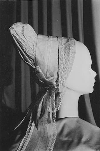 le dessus de cette coiffe est d'origine, mais la caye et la cayenne ont été reconstituées par Mlle Guérin cette coiffe fut portée à Furigny (Vienne)
