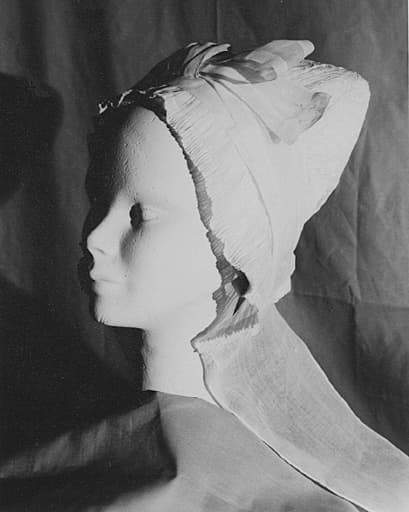 le dessus de cette coiffe est d'origine, la cayenne a été reconstituée par Mll e Guérin qui racontait que cette coiffe avait été portée en 1793 et qu'elle faisait partie d'un costume de mariage dont le musée conserve la robe