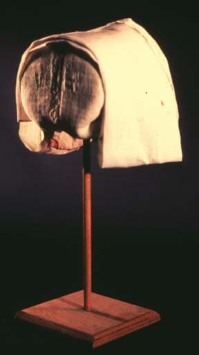 le dessus de cette coiffe est d'origine, mais la caye et la cayenne ont été reconstituées par Mlle Guérin qui racontait que cette coiffe avait été portée par une jeune fille en 1793