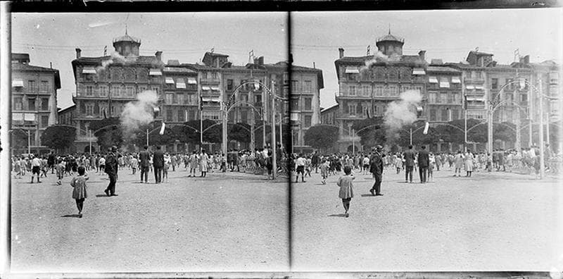 vue d'architecture (Espagne, Navarre, Pampelune, fête, fumée, foule, palais, place)