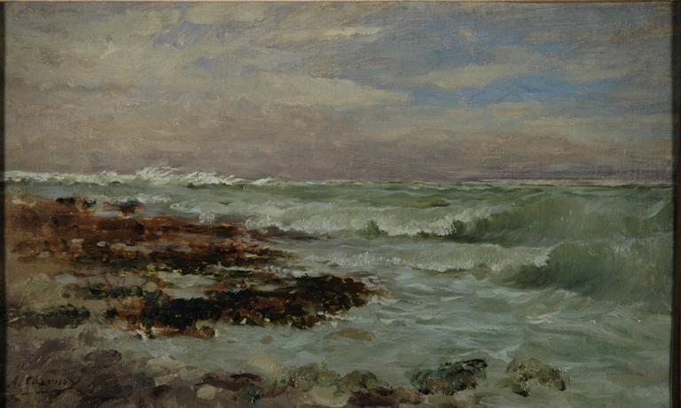Sbg 'A.Charnay'. Au revers, sur le châssis, le tampon 'MUSEE DE CHARLIEU' et, à la mine de plomb 'Le grand vent, tempête, Yport 74'