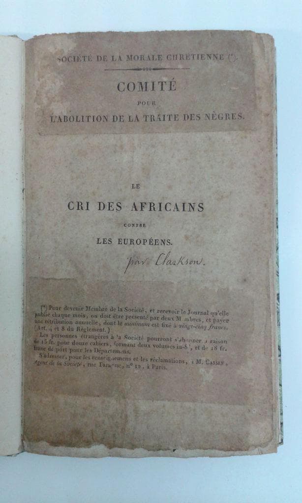 Traduction française d'après l'ouvrage de Thomas Clarkson en anglais 'Cries of Africa to the inhabitants of Europe'