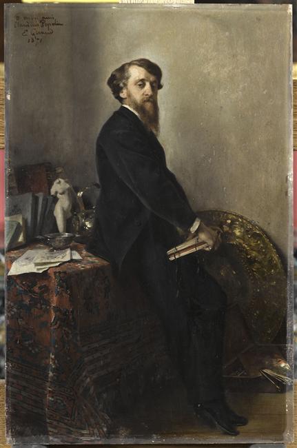 portrait (Popelin Claudius Marcel, homme, debout, de profil, table, statuette, bouclier, palette, pinceau)
