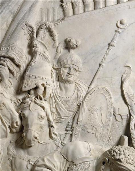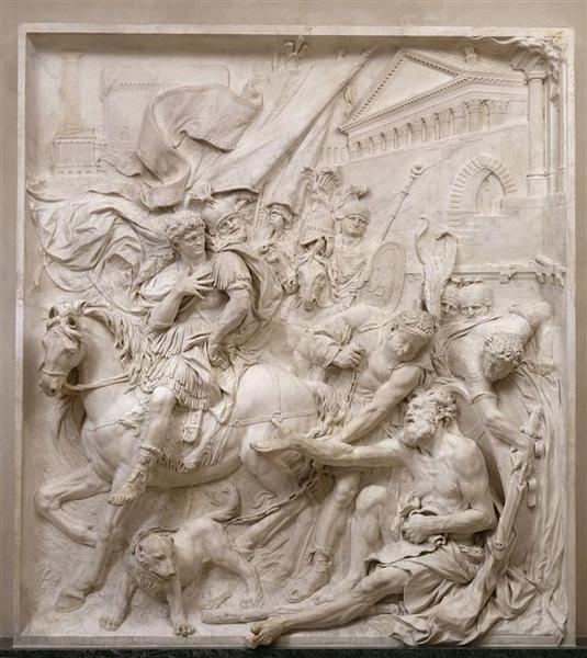 bloc de marbre délivré à Toulon par Colbert (1619-1683), surintendant des Bâtiments du Roi, en décembre 1671 ; marché passé pour un groupe en 1672, mais dessin préparatoire d'un relief en 1676 ; transporté de Toulon à Marseille en 1681 ; terminé en 1689 ; parfait paiement, 31 décembre 1689 ; transporté de Toulon au Havre le 8 décembre 1697 ; transporté à Paris sur ordre d'Edouard Colbert de Villacerf (1629-1699), surintendant et ordonnateur général des Bâtiments du Roi, le 17 février 1698 ; placé au Louvre Salle des Cent-Suisses en 1752 ; attesté au Louvre, salle des Antiques de 1765 à 1792