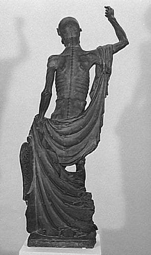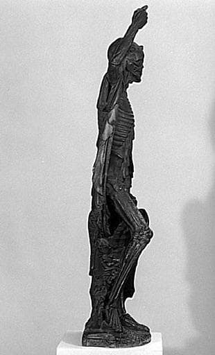 placée dans une guérite de bois au centre du cimetière des Innocents à Paris ; après la suppression du cimetière le 1er décembre 1780, l'oeuvre fut déposée dans l'église Saint-Gervais en juin 1786 ; transportée à Notre Dame en 1788, bronzée et complétée par Louis Pierre Deseine (1749-1822), puis placée dans la chapelle d'Harcourt