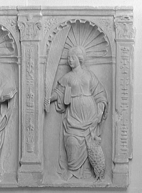 élément du parement de l'enfeu ; élément original du tombeau de Renée d'Orléans-Longueville, fille de François II d'Orléans ; duc de Longueville (mort en 1512), et de Françoise d'Alençon, morte à l'âge de 7 ans le 23 mai 1515 ; état ancien connu par un dessin des Albums de Roger de Gaignières, une gravure des Antiquités Nationales de Millin et un dessin de l'album Lenoir (département des Arts graphiques) ; le monument était érigé dans la chapelle d'Orléans du couvent des Célestins de Paris ; le musée du Louvre conserve d'autres éléments provenant de ce tombeau : un écusson aux armes de la reine Claude de France soutenu par deux anges : RF 459, la statue gisante : RF 3051 A, la Licorne : RF 3051 B, une dalle où est inscrite l'épitaphe : RF 3051 C, cinq éléments du parement du soubassement : RF 3051 D à RF 3051 H ; trois autres éléments de l'enfeu : RF 3051 I à RF 3051 L, deux chapiteaux : RF 3051 M et RF 3051 N, deux pilastres situés à droite et à gauche de l'enfeu : RF 3051 O et RF 3051 P, tous ces éléments étant des originaux ; et des pastiches conçus au 19e siècle : deux bases de pilastres : RF 3051 Q et RF 3051 R et un petit pilastre de l'enfeu : RF 3051 S, un pilier : RF 3051 T et une sainte tenant une torche : RF 3051 U