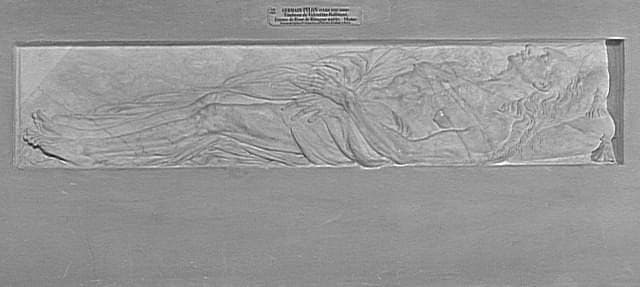 élément du monument funéraire de Valentine Balbiani (Chiari, 1518 Paris, 1572), épouse de René de Birague (1506 - 1583). Monument exécuté après un premier contrat passé entre René de Birague et le sculpteur le 29 avril 1573, complété par un marché du 7 avril 1574. Placé dans la chapelle funéraire de Birague dans l'église Sainte-Catherine-du-Val-des-Ecoliers à Paris (disposition primitive connue par un dessin de la collection Gaignières). Eléments transférés en 1783 dans l'église Saint-Louis-des-Jésuites (actuellement Saint-Paul-Saint-Louis)