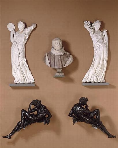 éléments du monument funéraire de Christophe de Thou ; monument commandé par l'historien et parlementaire Jacques Auguste de Thou (1553-1617), fils du défunt, pour la chapelle de Thou dans l'église Saint-André-des-Arcs à Paris, d'après l'acompte versé au sculpteur le 9 octobre 1585 (disposition primitive connue par un dessin de la collection Gaignières) ; démembré sous la Révolution