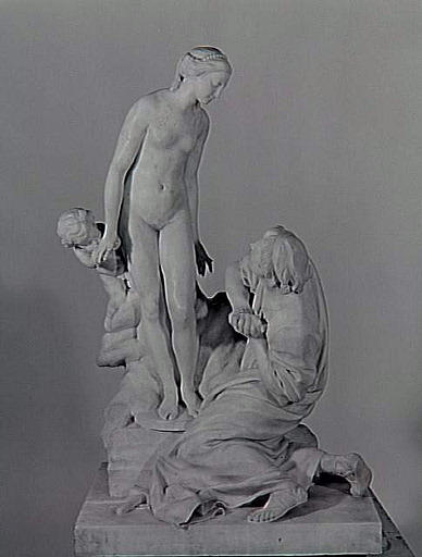 figures mythologiques (Pygmalion, Galatée, Eros) ; Galatée (en pied, penché, nu, coiffure) ; Eros ; Pygmalion (agenouillé, joie, amour, étonnement, sculpteur)