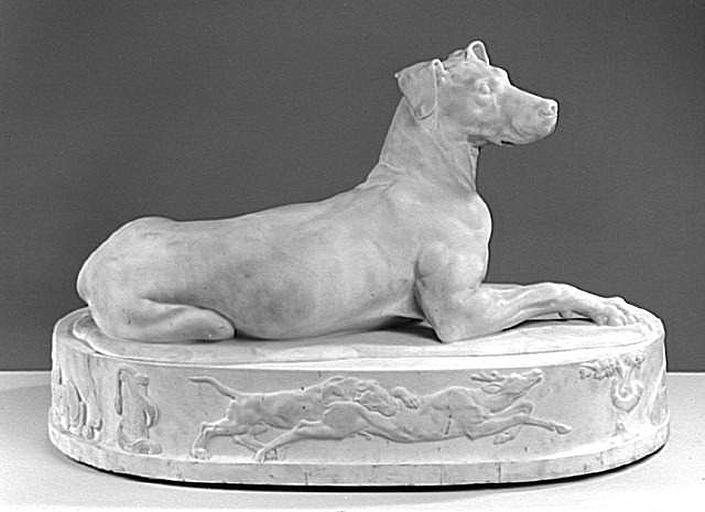 plinthe ornée de bas-reliefs illustrant les qualités du chien : Fidélité, Courage, Vigilance et Agilité ; le modèle fut exécuté à Rome ; le marbre fut acquis par le ministère de la Maison du roi le 29 mai 1828 ; un exemplaire en plâtre est conservé au musée de Toul ; il existe des réductions en bronze dont une est déposée au musée de Riom (RF 389)