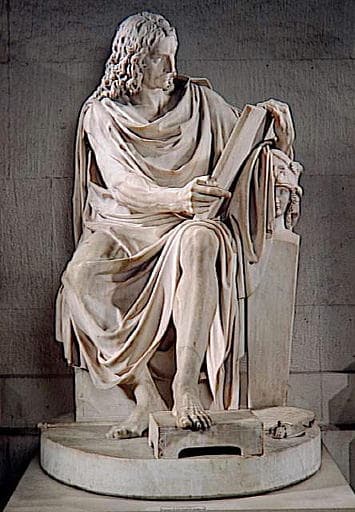 commandé en 1787 par Le Comte d'Angiviller,(1730-1809) directeur général des Bâtiments du roi, pour la série des Grands Hommes de la France (mentionné dans une liste arrêtée le 10 février 1788) ; exécuté grâce au prix d'encouragement obtenu à l'issue du Salon de 1791 ; le modèle en plâtre a figuré au Salon de 1789, n°228 ; une maquette en terre cuite est conservée au Louvre (RF 1364) ;