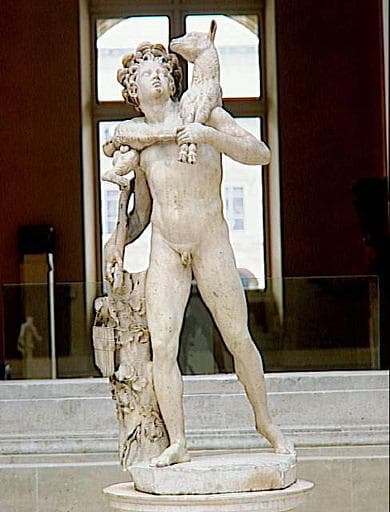 copie d'après, un modèle connu sous le nom du Petit Faune de la reine de Suède, de la collection de Christine de Suède (1626-1689) à Rome (actuellement à Madrid, musée du Prado) ; exécutée à Rome lors du séjour du sculpteur à l'Académie de France, à partir de 1684 ; prête à être expédier en France en juin 1687 et placée dans le parc de Marly, dans les appartements verts, avant 1695 ; décrite dans l'inventaire de 1707 au bosquet du couchant