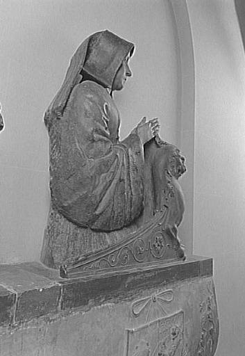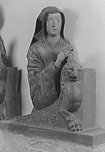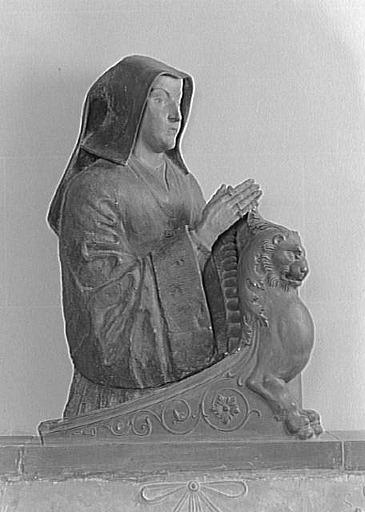 portrait (rétrospectif, Chambes Hélène de, femme, agenouillé, à mi-corps, main : joint, bijou, coiffe, robe, prie-Dieu) ; prie-Dieu (en forme de : griffe, arabesque)