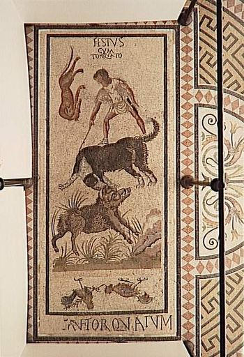 Un examen détaillé des tesselles montre que cette scène est formée de plusieurs fragments antiques présentant à la fois des réfections malhabiles et des compléments modernes très soignés, dont il est difficile d'apprécier l'étendue. Le gros chien et la tête du sanglier, en particulier, semblent refaits ; cette intervention explique peut-être la disproportion qui existe entre les deux animaux combattants et l'homme placé au-dessus.