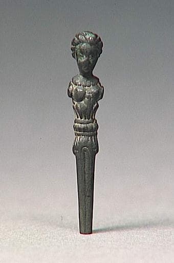 Provenance : Italie. Des épingles à cheveux relativement comparables, les comatoria ont été utilisées pendant l'antiquité. En os, en ivoire ou en métal précieux, elles sont cependant décorées soit d'une figure en pied, souvent Vénus, soit d'une tête, mais très rarement d'un buste. La morphologie de l'épingle de Chantilly et son traitement très décoratif la rendent douteuse, malgré sa forte usure.
