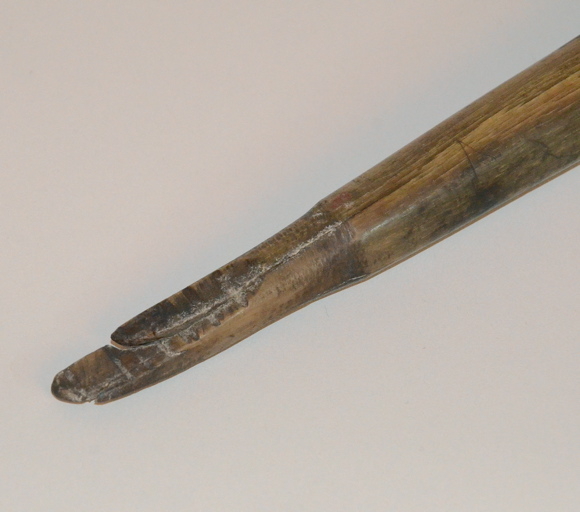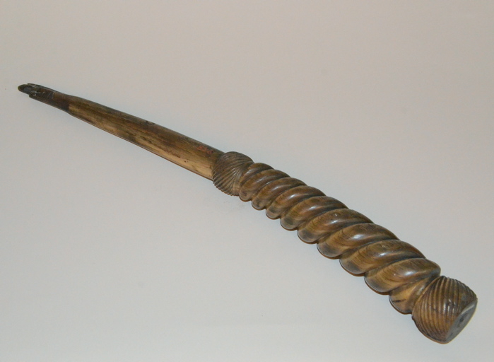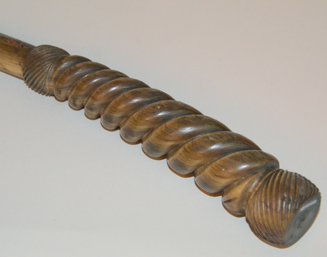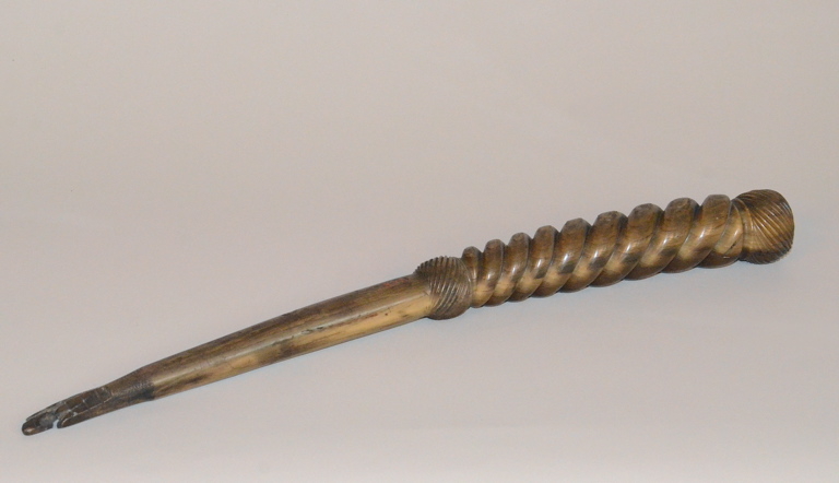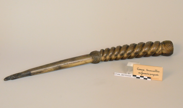 épais manche torsadé entre deux boules gravées de rayures inclinées ; pointe éffilée ; le tout taillé dans une corne.