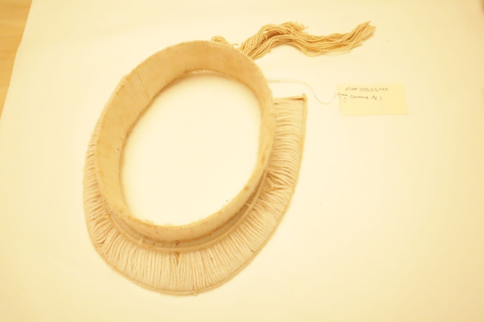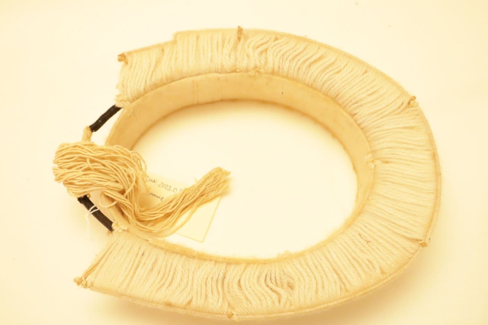 éclats de palmier-bâche (buriti), recouverts de laine, surmontés d’une visière en laine. La visière est montée en coton