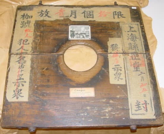 La cangue, en chinois mu jia ( ), est un châtiment similaire au pilori en Occident, à la différence que le bord de la cangue n'était pas fixé à une base et devait être porté par le prisonnier. Le crime et la peine étaient écrites sur le devant. Le condamné devait mendier sa nourriture. Ce type de supplice était pour des peines assez courtes : de 2 semaines à 3 mois. ; condamné (utilisateur)