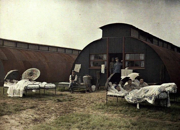 portrait collectif ; victime de conflit ; lit ; parapluie ; ombrelle ; militaire ; Première guerre mondiale
