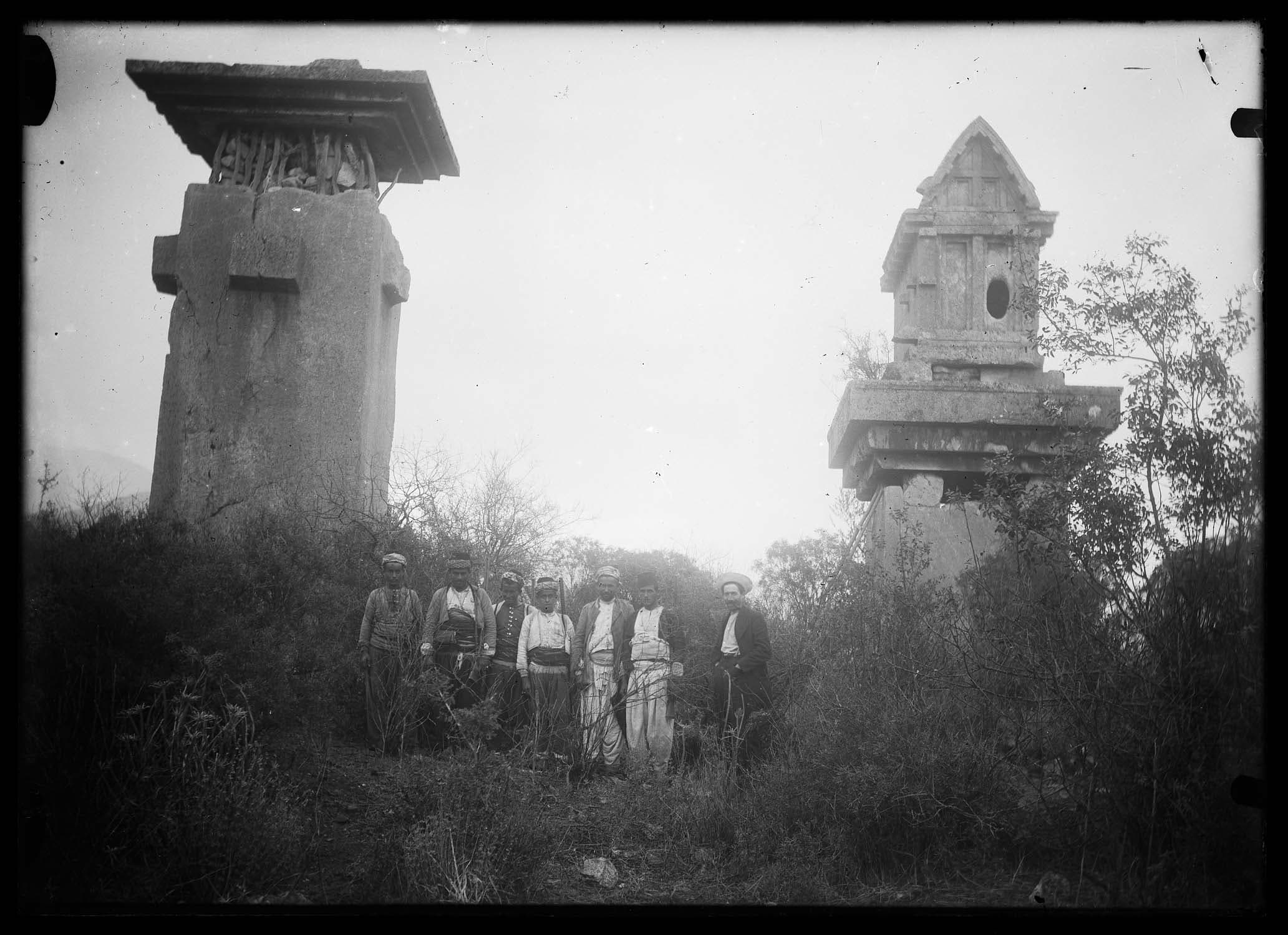 POP | Plateforme ouverte du patrimoinePersonnages entre des piliers funéraires : à gauche, le pilier des Harpyies et à droite, sarcophage sur pilier