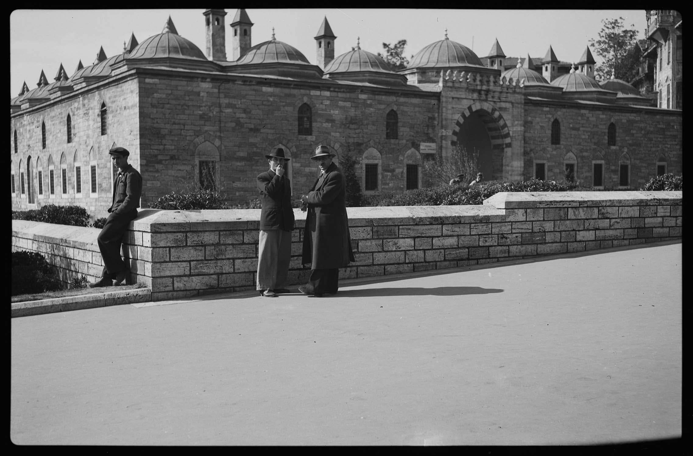 POP | Plateforme ouverte du patrimoineVue d'ensemble de la medrese, avec trois personnages au premier plan