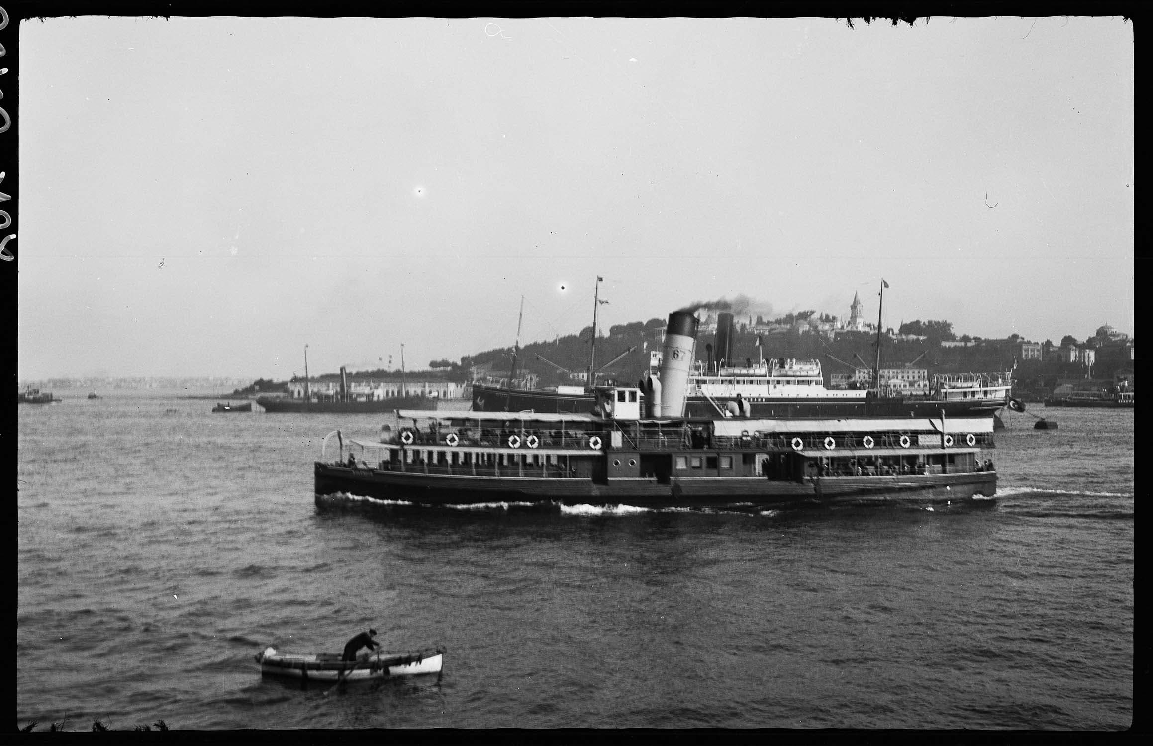 Vue de la pointe du Sérail, avec un bac à vapeur au premier plan
