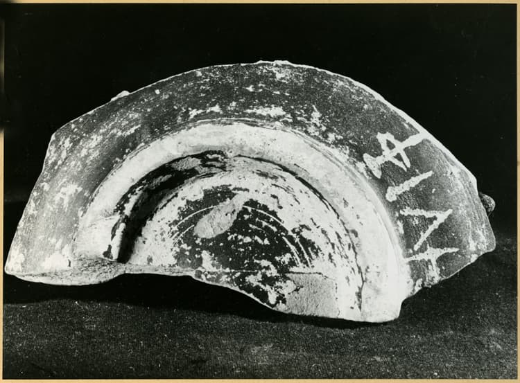 Fouilles de 1946 : tesson avec graffitis, en céramique