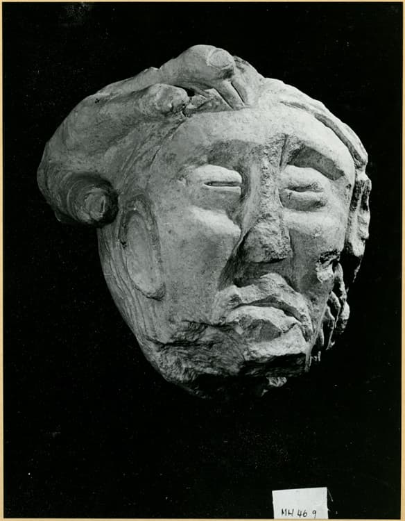 Fouilles de 1946 : tête coupée, main gauche sur la tête