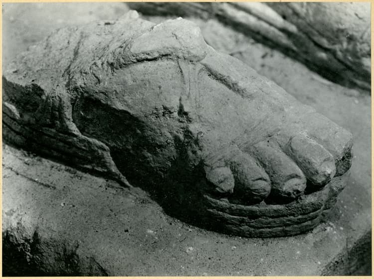 Fouilles de 1946 : socle avec deux pieds et sandales, pied gauche