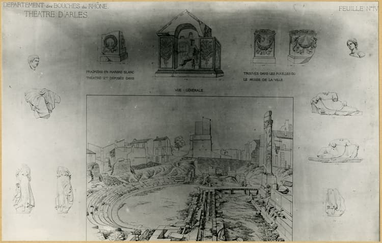 Reproduction de dessin en perspective et de fragments trouvés dans les fouilles