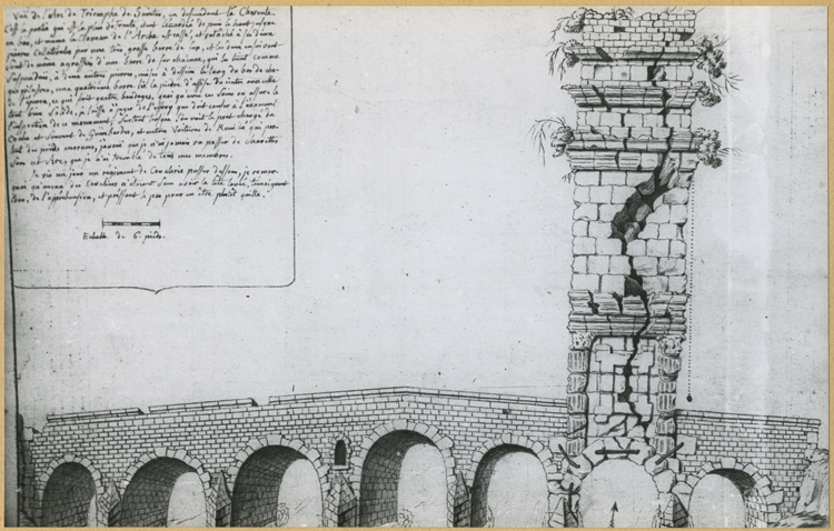 Dessin : élévation d’un côté de l’arc de triomphe, fissures