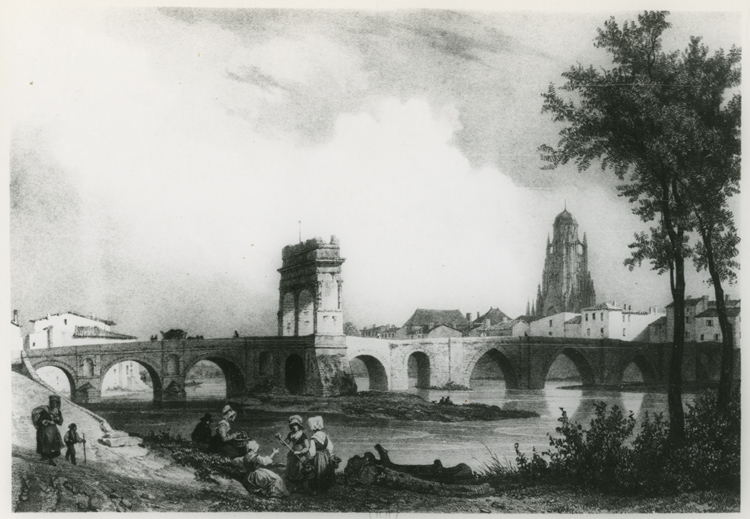 POP | Plateforme ouverte du patrimoineReproduction d’une lithographie : vue de l’ancien pont avec l’arc de triomphe en son milieu