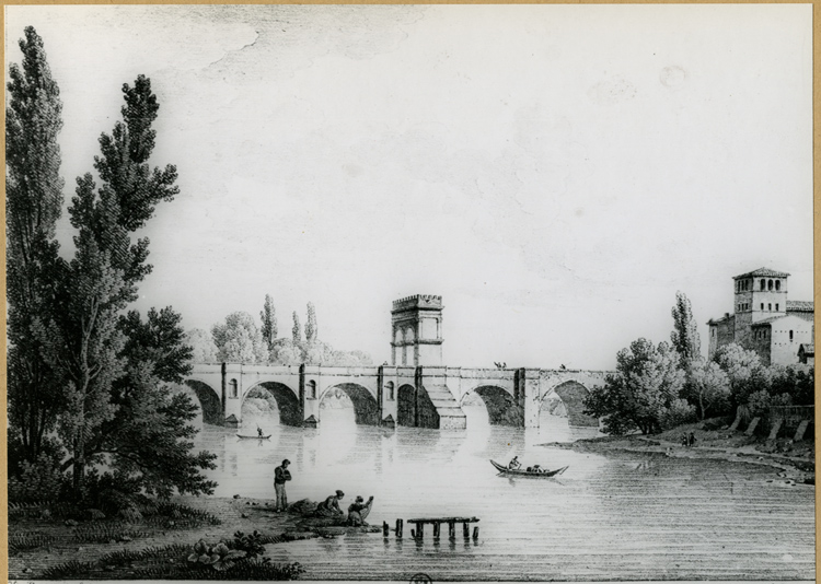 POP | Plateforme ouverte du patrimoineReproduction d’une lithographie : vue d’un arc romain sur le pont de Sainte