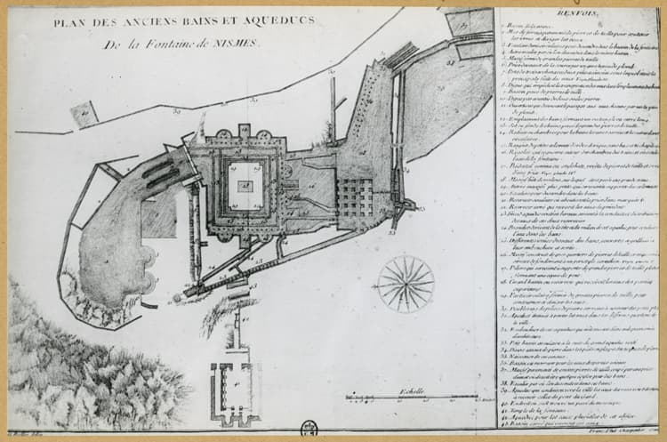 Reproduction de plan avec légende : bains et aqueduc de la Fontaine