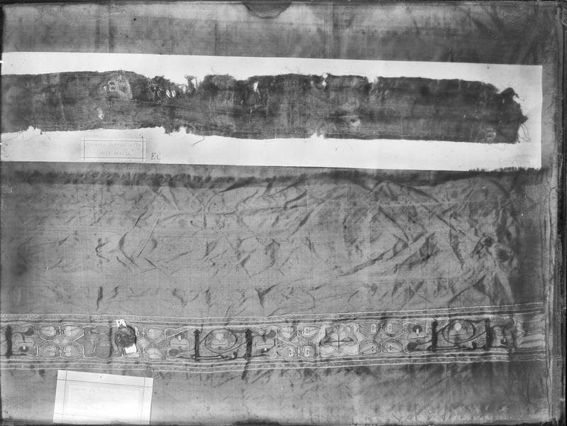 Photographie de deux tissus du Trésor de la cathédrale de Sens. En bas, le deuxième suaire de sainte Colombe, en soie et or, trouvé dans la châsse de la sainte, lors de son ouverture en 1870 (Inv. TC B 3) ; il s'agit d'un tissu hispano-islamique du 13e siècle. On distingue sur la photographie le sceau en cire de l'abbaye Sainte-Colombe apposé sur le suaire. En haut, une soierie sarrazinoise du 13e siècle (Inv. TC B 206b).