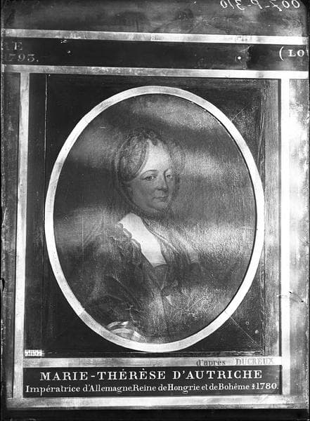 Photographie d'un portrait en médaillon sur cadre rectangulaire de l'impératrice d'Allemagne, Marie-Thérèse d'Autriche (1717-1780) par Joseph Ducreux (1735-1802), conservé au musée national des Châteaux de Versailles et de Trianon (numéros d'inventaire : MV 3859 ; INV 2151 ; LP 2372). Le portrait est identifié par une inscription au bas "Marie-Thérèse d'Autriche, impératrice d'Allemagne, reine de Hongrie et de Bohême, + 1780". Il faisait partie d'une série de petits portraits de la famille de l'empereur François Ier.