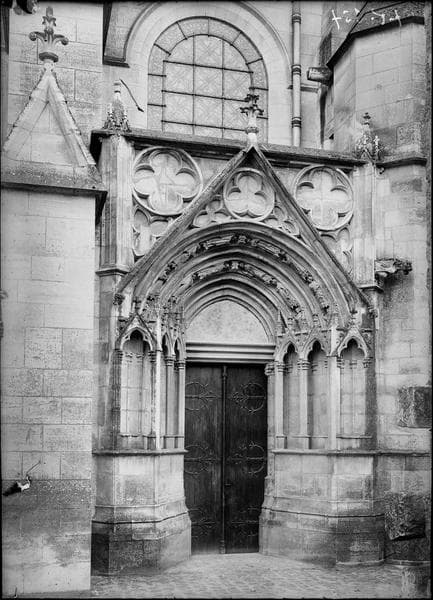 Cliché du portail Saint-Denis de la cathédrale de Sens. Cette ancienne porte, qui ouvrait sur la troisième travée du bas-côté nord, correspond à l'accès à l'édifice du côté de l'ancien cloître des chanoines. Au-dessus du passage, une chapelle haute avait été aménagée au 14e siècle. Elle fut supprimée lors des restaurations menées par Adolphe Lance dans la deuxième moitié du 19e siècle, mais il reste de cette ancienne disposition l'escalier qui permettait l'accès à la chapelle haute (visible à l'extrémité droite du cliché). Les rares vestiges du décor du portail se situent dans les voussures (figures d'anges) ; les statues des ébrasements et le tympan ont disparu à la Révolution.